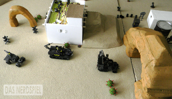 In retrospect, the gang should have driven off the table with their winnings right then, but at the time, that seemed rather un-Orky. Instead I decided to plow through Urzig's scattered forces and get a few more shots off before the game ended.