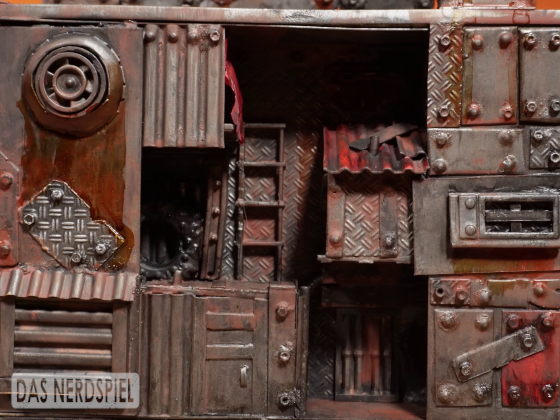 I was trying to come up with a color scheme that looked appropriately eclectic for an Ork fort built from salvaged scrap, but also cohesive enough to look like an actual building that could exist within an environment. So the exterior armor panels of the fort are pretty much split, with half being bare metal, and the other half being painted.